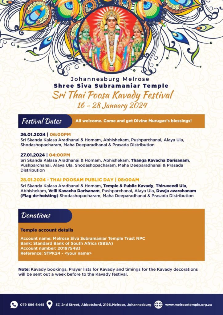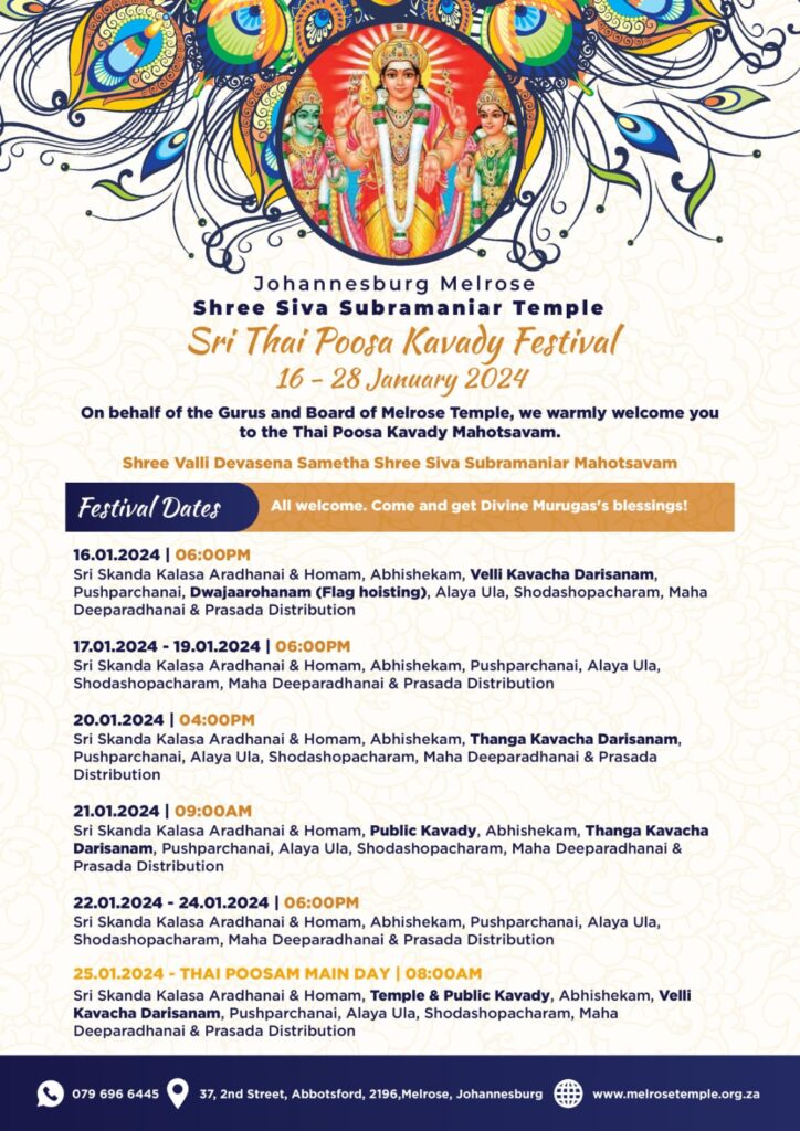 On behalf of the Gurus and Board of Melrose Temple, we warmly welcome you to the Thai Poosa Kavady Mahotsavam.